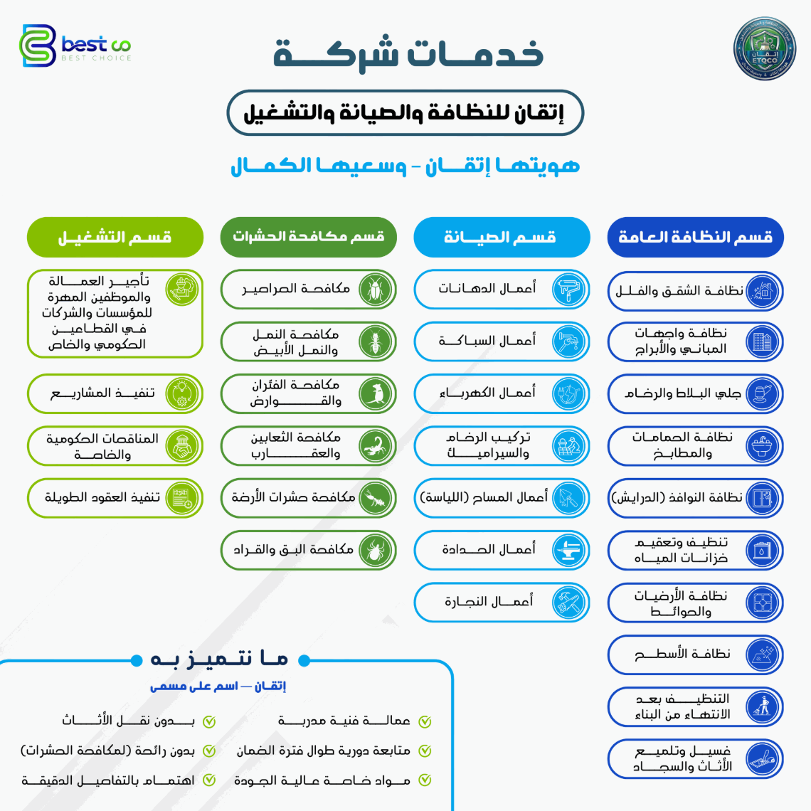 شركة إتقان إحدى شركات الاختيار المناسب ( Bestco ) تأسست في عام 2005م وتعتبر من الشركات الرائدة بالمملكة العربية السعودية في تقديم مجموعة من خدمات النظافة الشاملة ومكافحة الحشرات والصيانة ونقل الاثاث لمختلف القطاعات العام والخاص والافراد ) عبر فريق عمل متخصص ذو خبرة وكفاءة عالية يرى التحديات فرصا للتطوير المستمر لضمان تحقيق شراكات مستدامة مع عملائنا